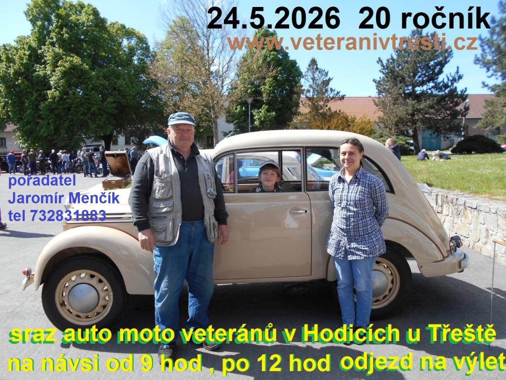 Dvacátý ročník spanilé jízdy veteránů v režii třešťského nadšence, sběratele a všeuměla Jaromíra Menčíka začíná v nedělůi 24. května 2026 v 9:00 na návsi v Hodicích.