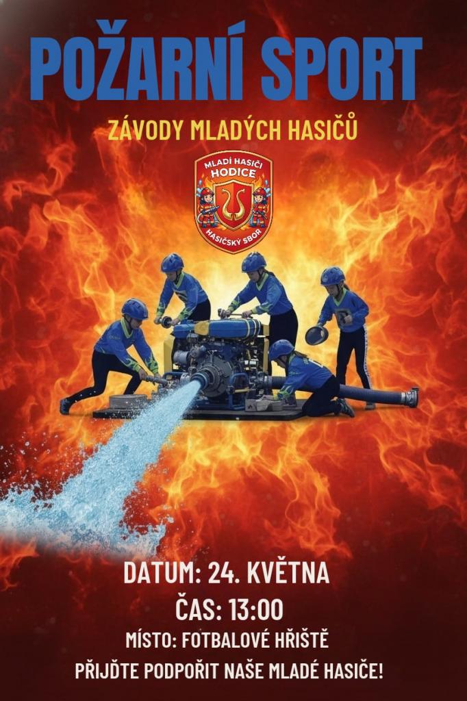 Zveme Vás na soutěž mladých hasičů v požárním sportu. Fandit mladým sportovcům můžete v neděli 24. května od 13 hodin na hřišti v Hodicích.