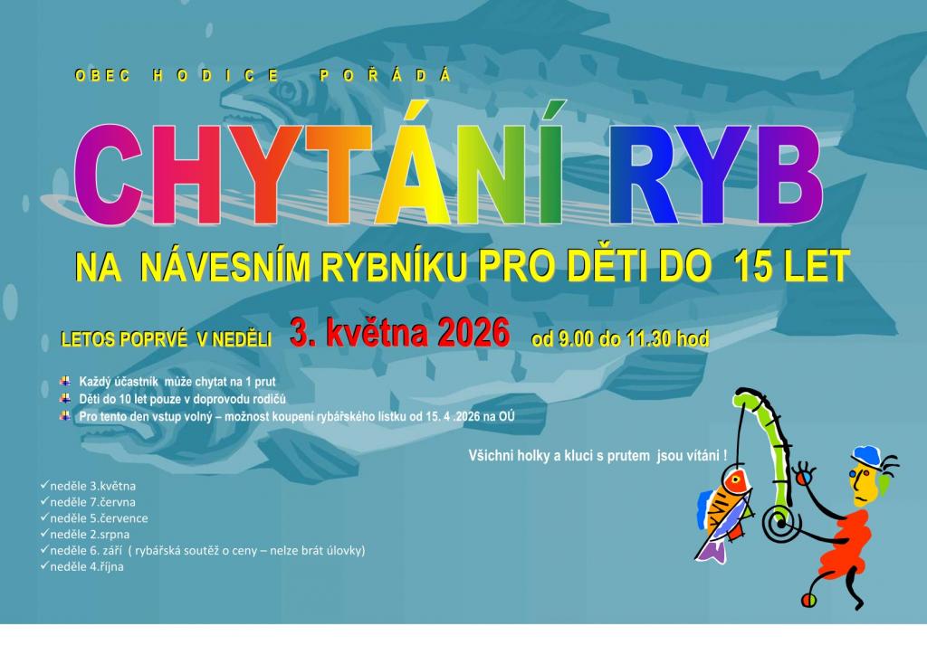 V neděli dopoledne 3.května 2026 bude na návesním rybníku v Hodicích začínat letošní dětšké chytání ryb (do 15 let věku). Rybářský lístek v hodnotě 100 Kč si můžete koupit na OÚ Hodice od 14.4.2026.